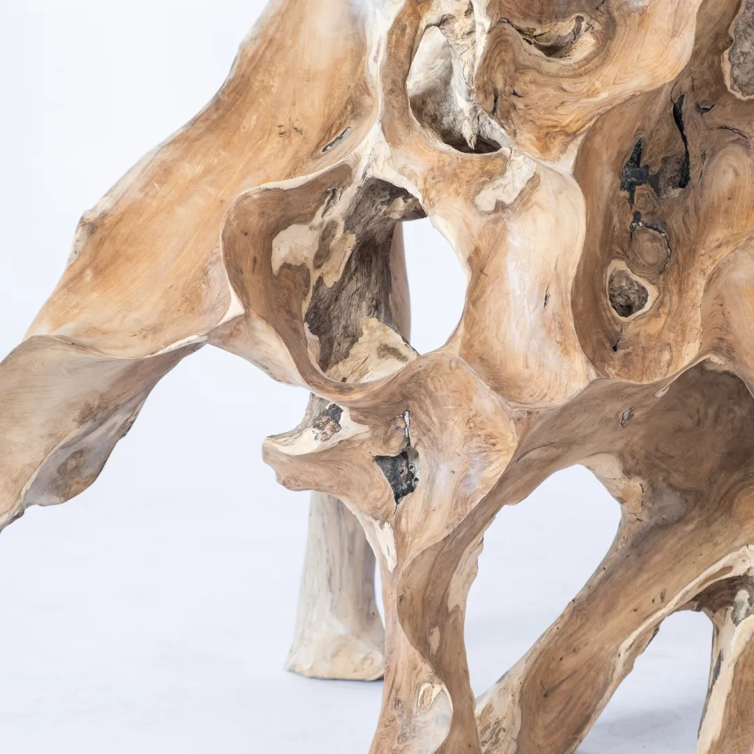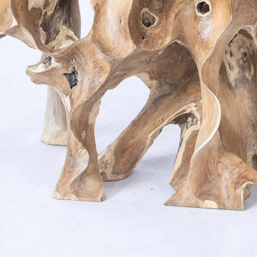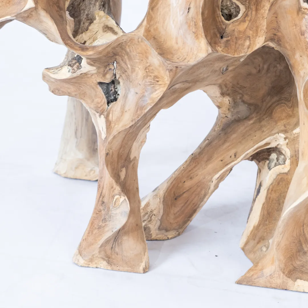 Aparador confeccionado con raíz de teka esculpida y pulida manualmente. Piezas únicas.