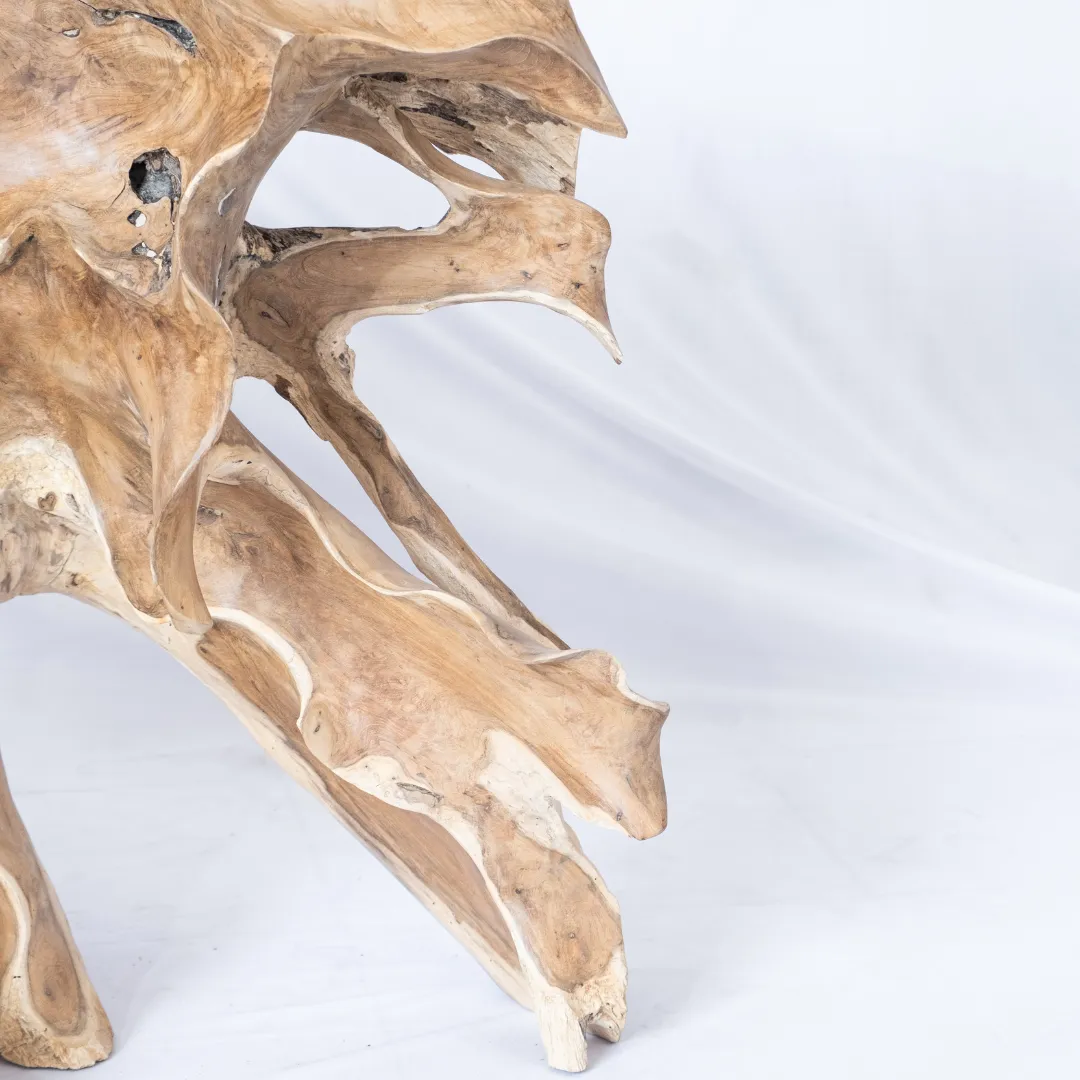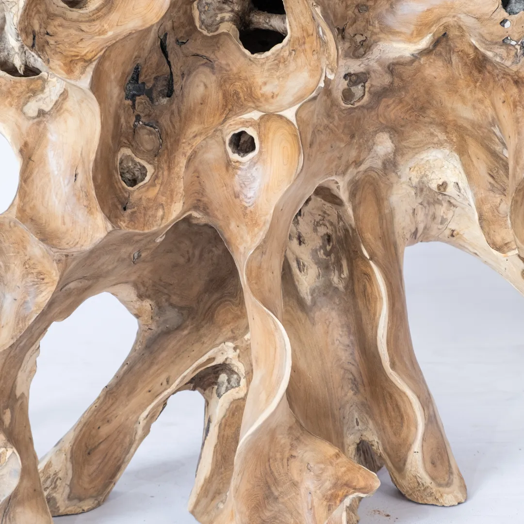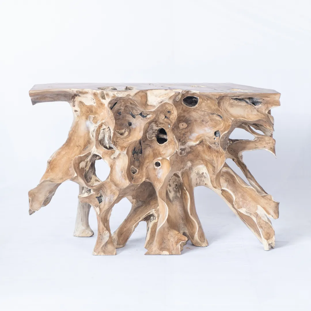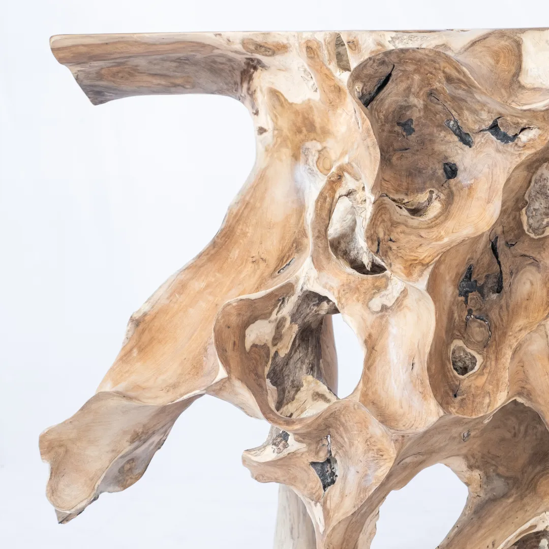 Aparador confeccionado con raíz de teka esculpida y pulida manualmente. Piezas únicas.