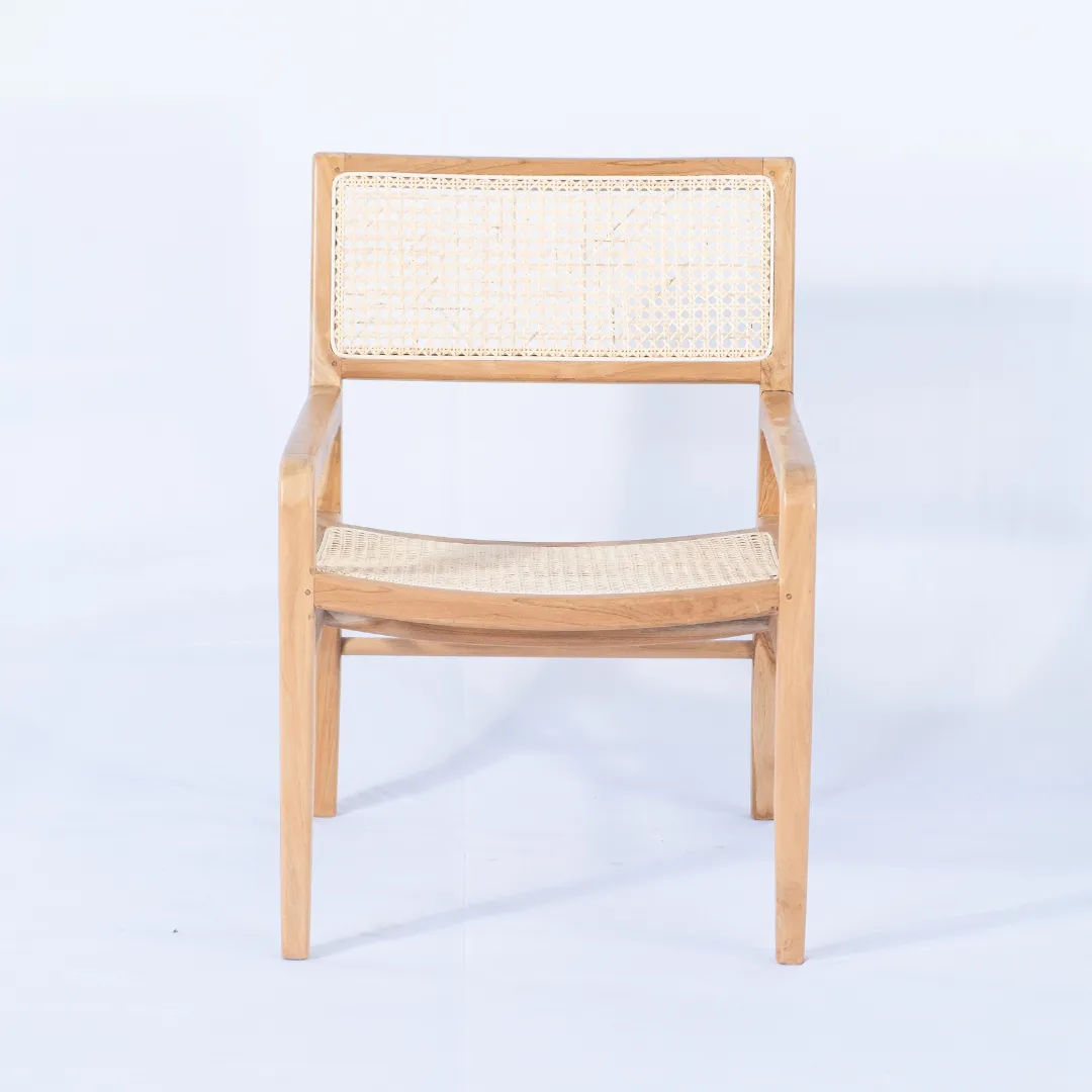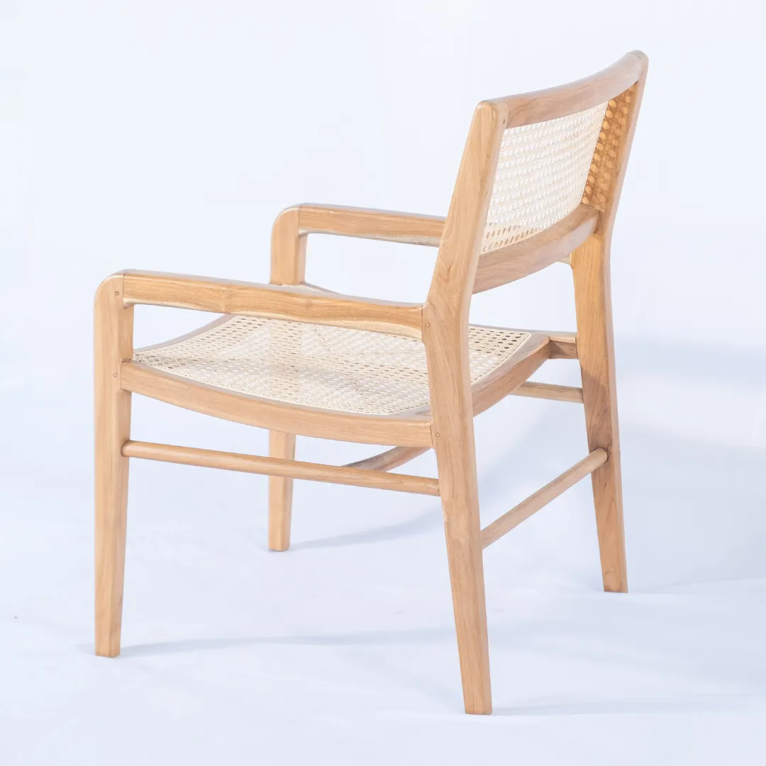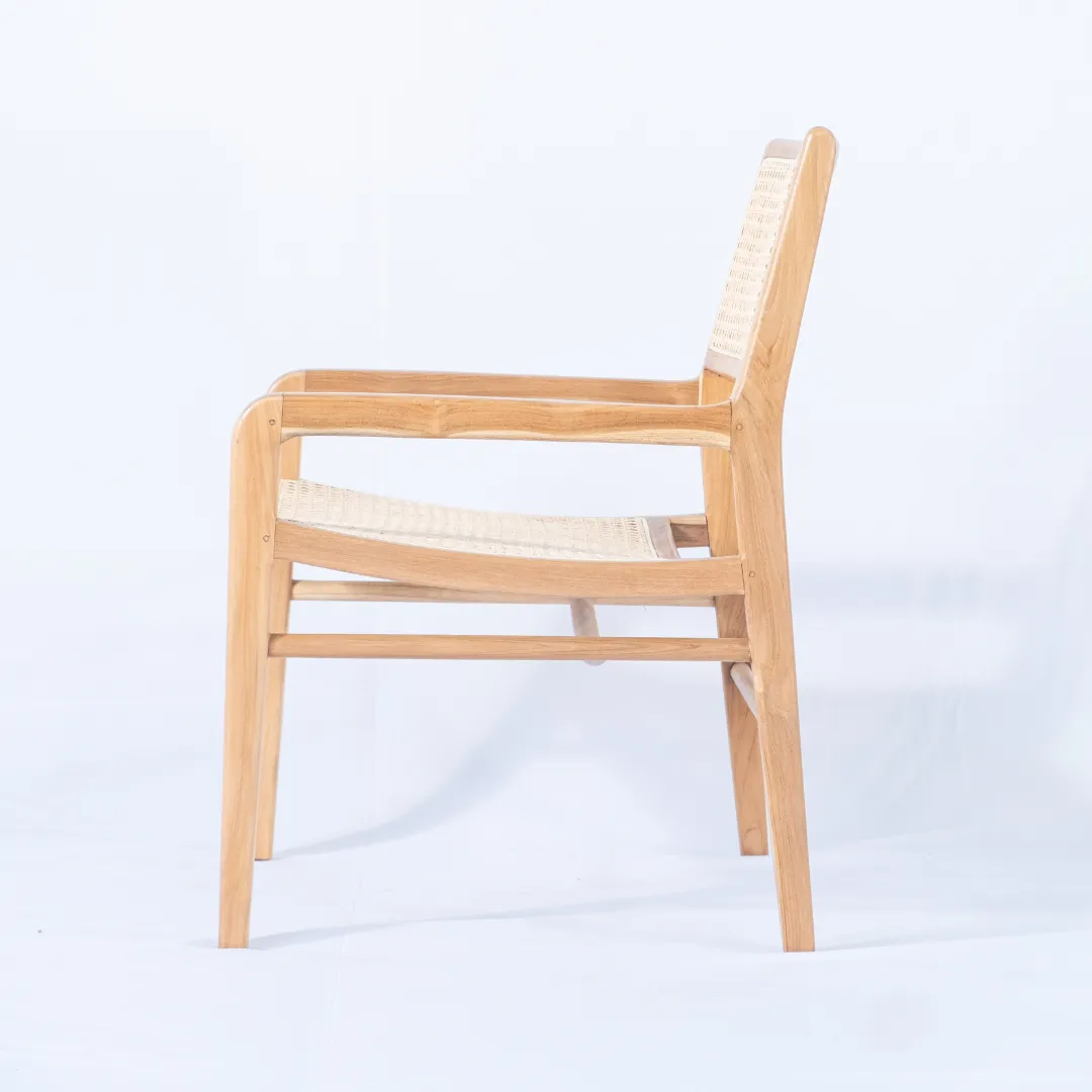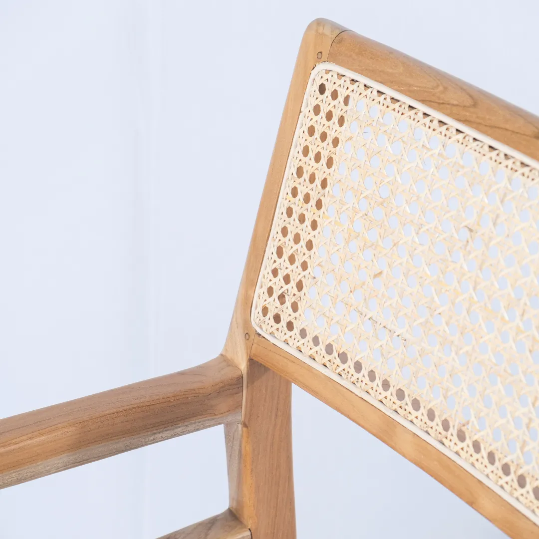 Butaca de madera de teka con respaldo de fibra natural de rattan esterilla, con apoyabrazos.