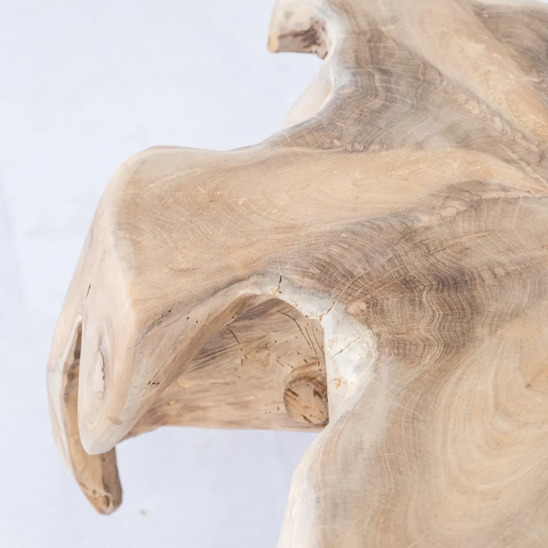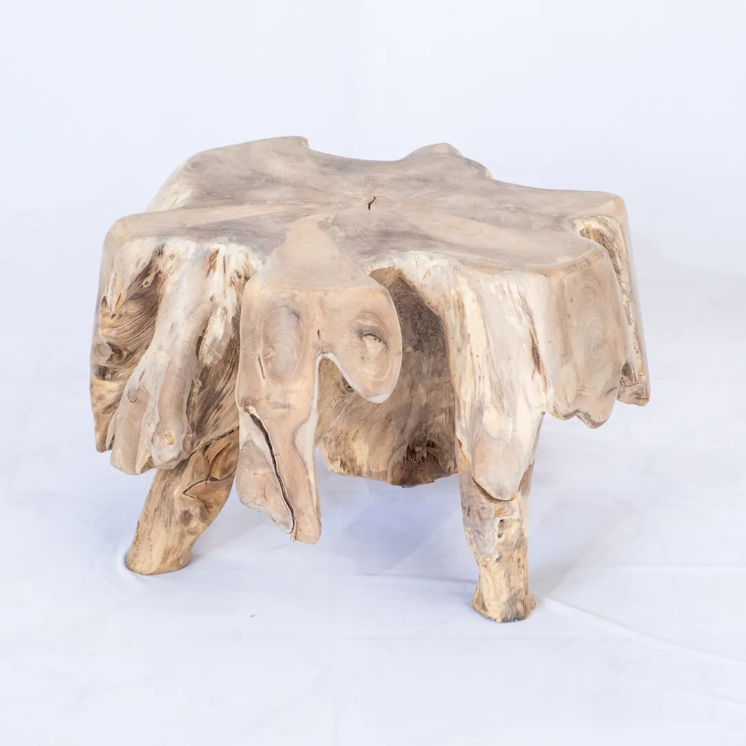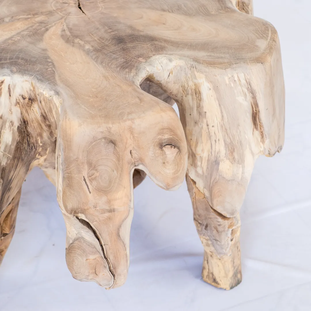 Mesa de centro o auxiliar hecha con raíz de teka esculpida y pulida manualmente. Piezas únicas.