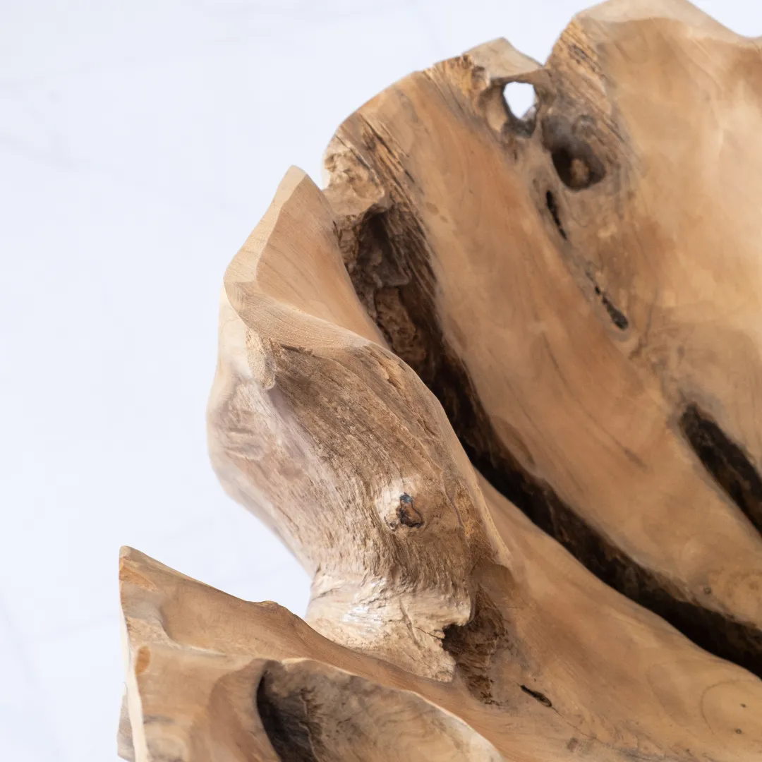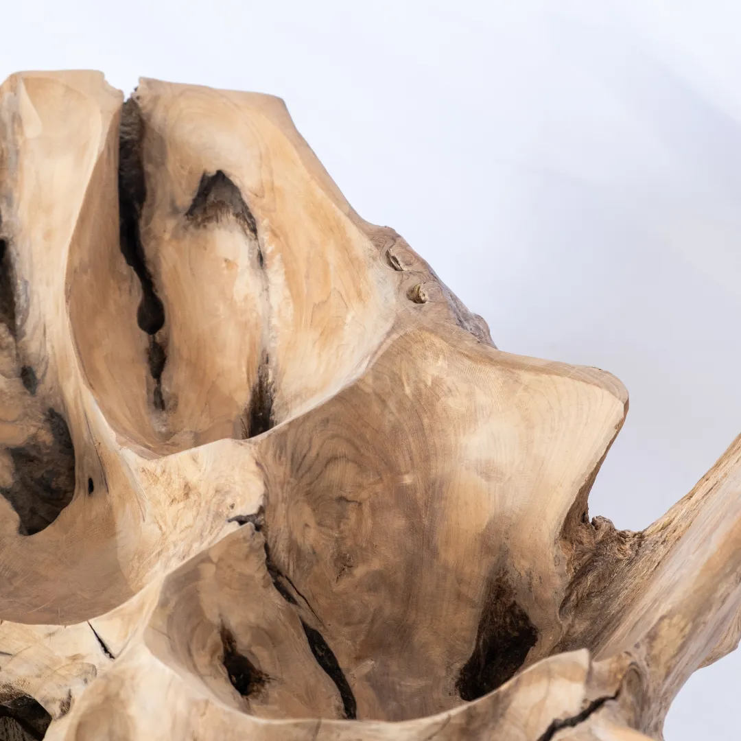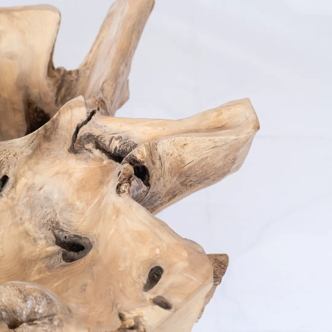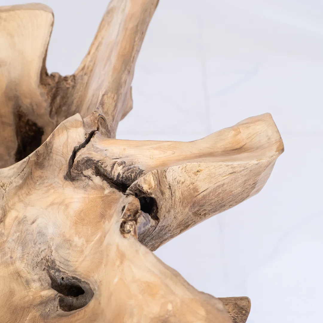 Base de mesa de centro o auxiliar hecha con raíz de teka esculpida y pulida manualmente. Se recomienda colocar tapa de vidrio de 1m 0 1,20 mts. La tapa de la mesa no esta incluida. Piezas únicas.