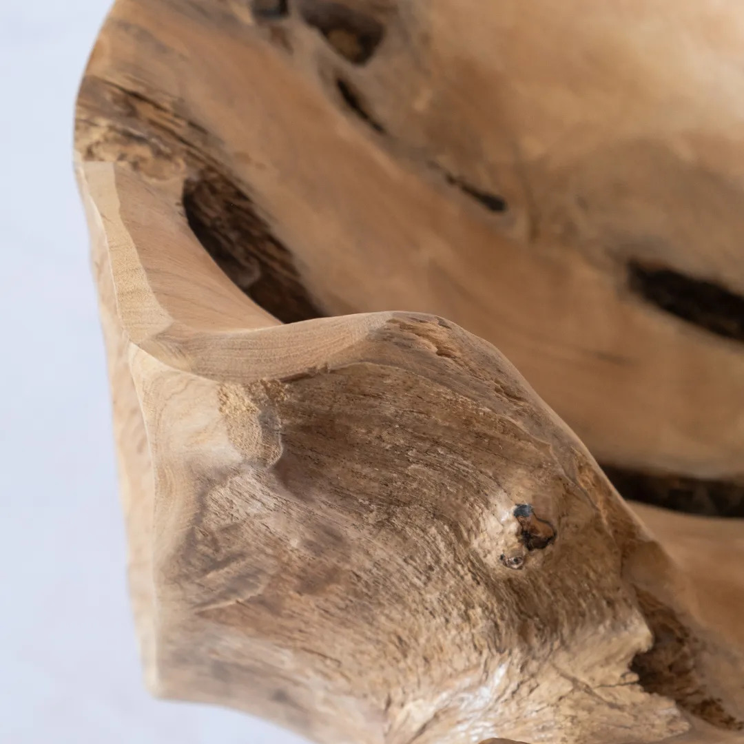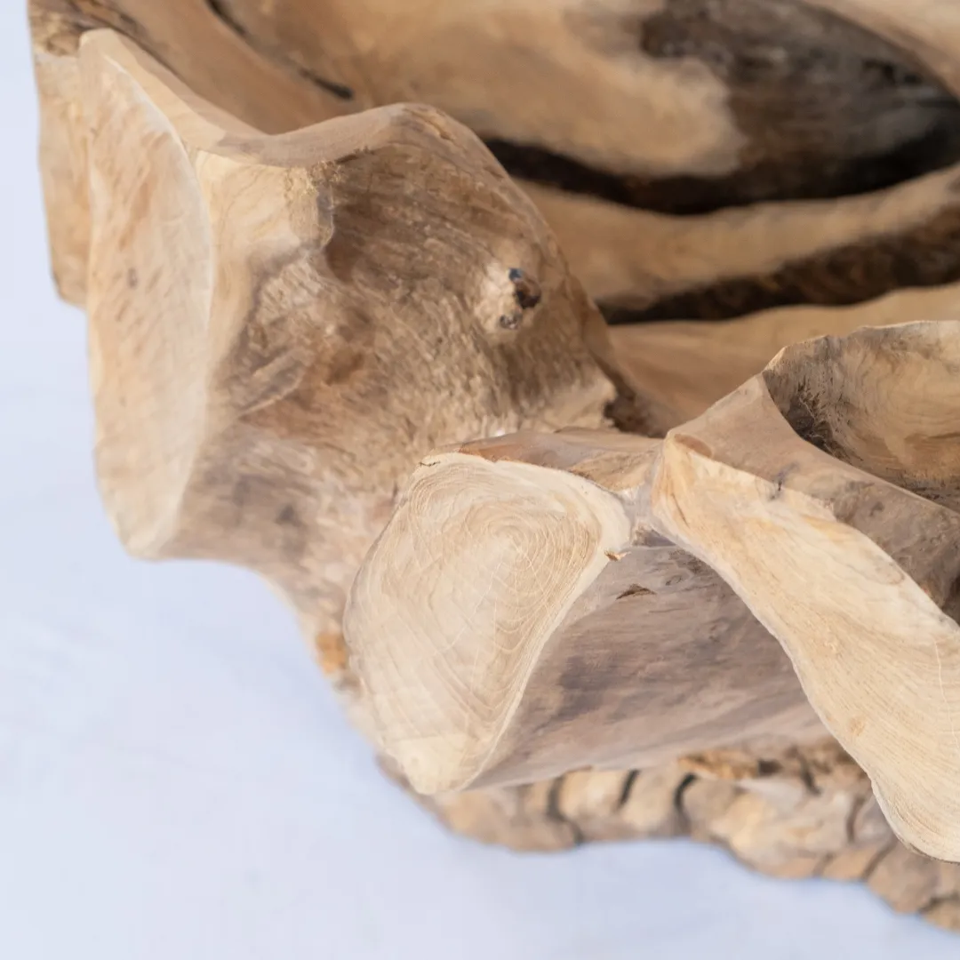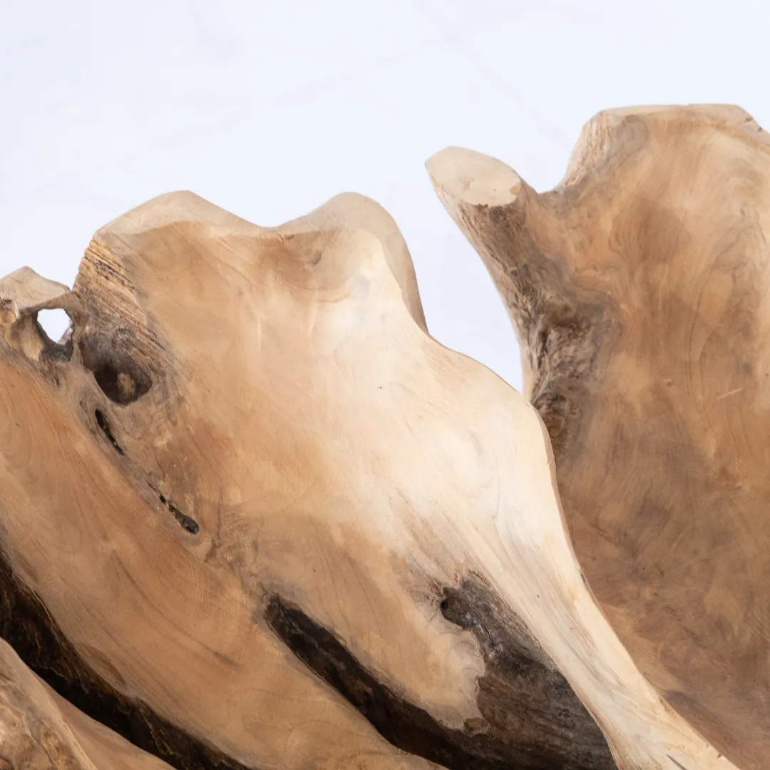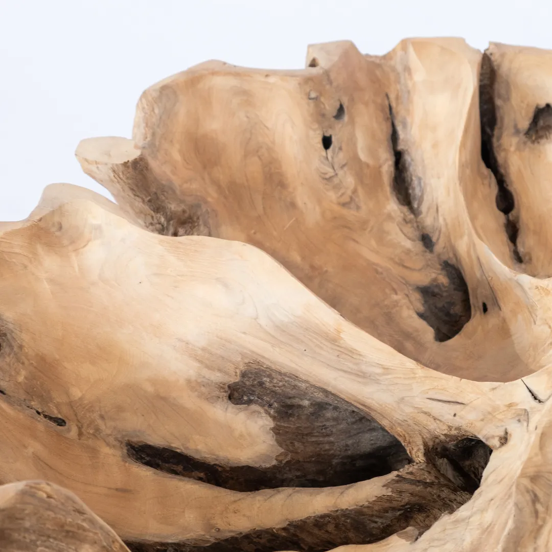 Base de mesa de centro o auxiliar hecha con raíz de teka esculpida y pulida manualmente. Se recomienda colocar tapa de vidrio de 1m 0 1,20 mts. La tapa de la mesa no esta incluida. Piezas únicas.