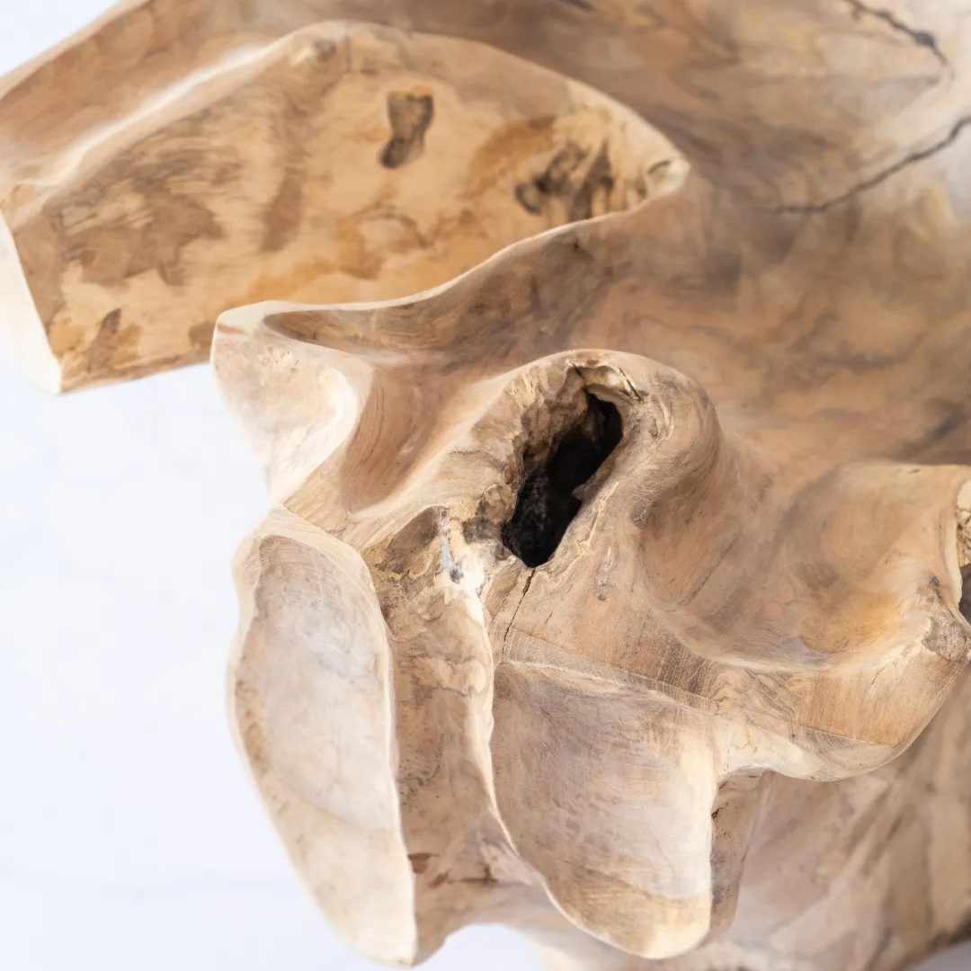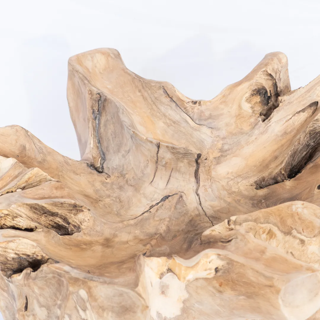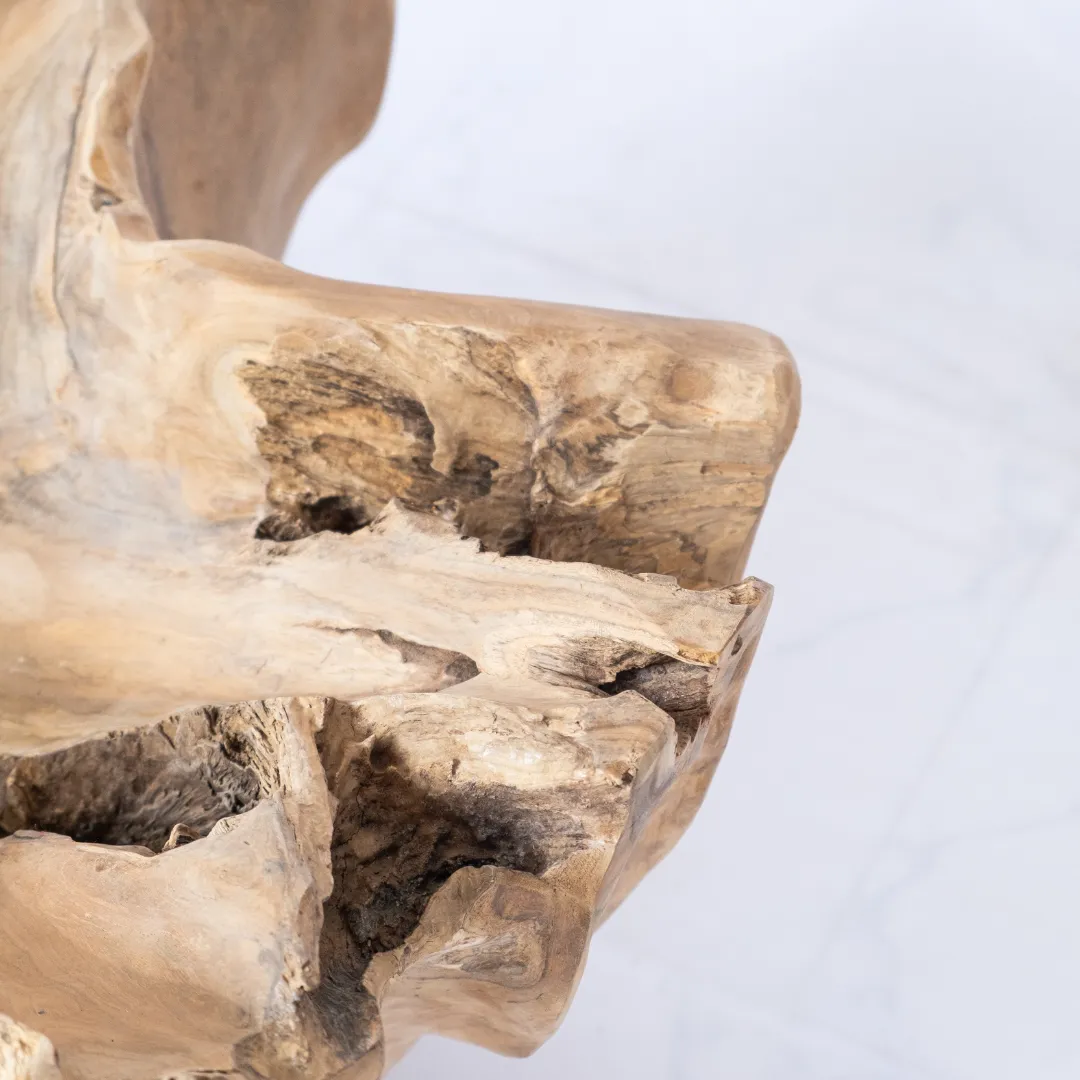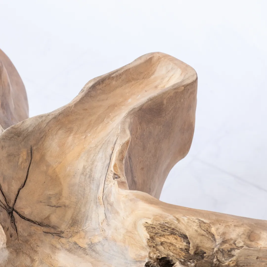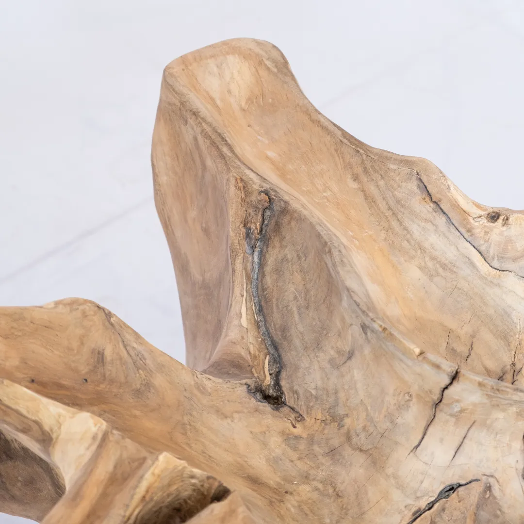 Base de mesa de centro o auxiliar hecha con raíz de teka esculpida y pulida manualmente. Se recomienda colocar tapa de vidrio de 1m 0 1,20 mts. La tapa de la mesa no esta incluida. Piezas únicas.