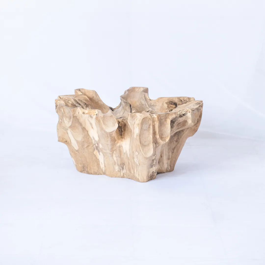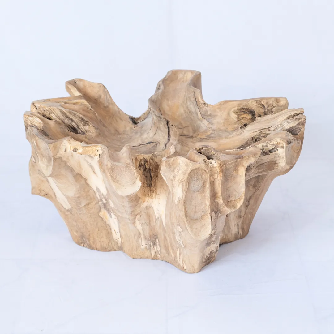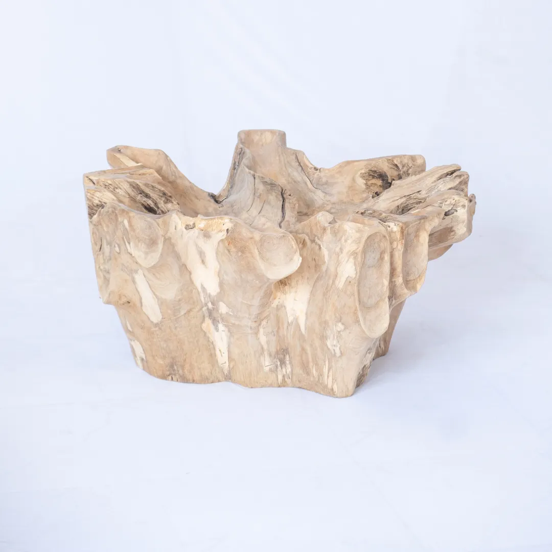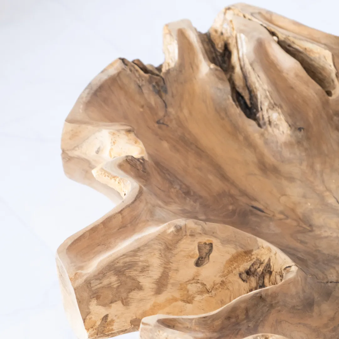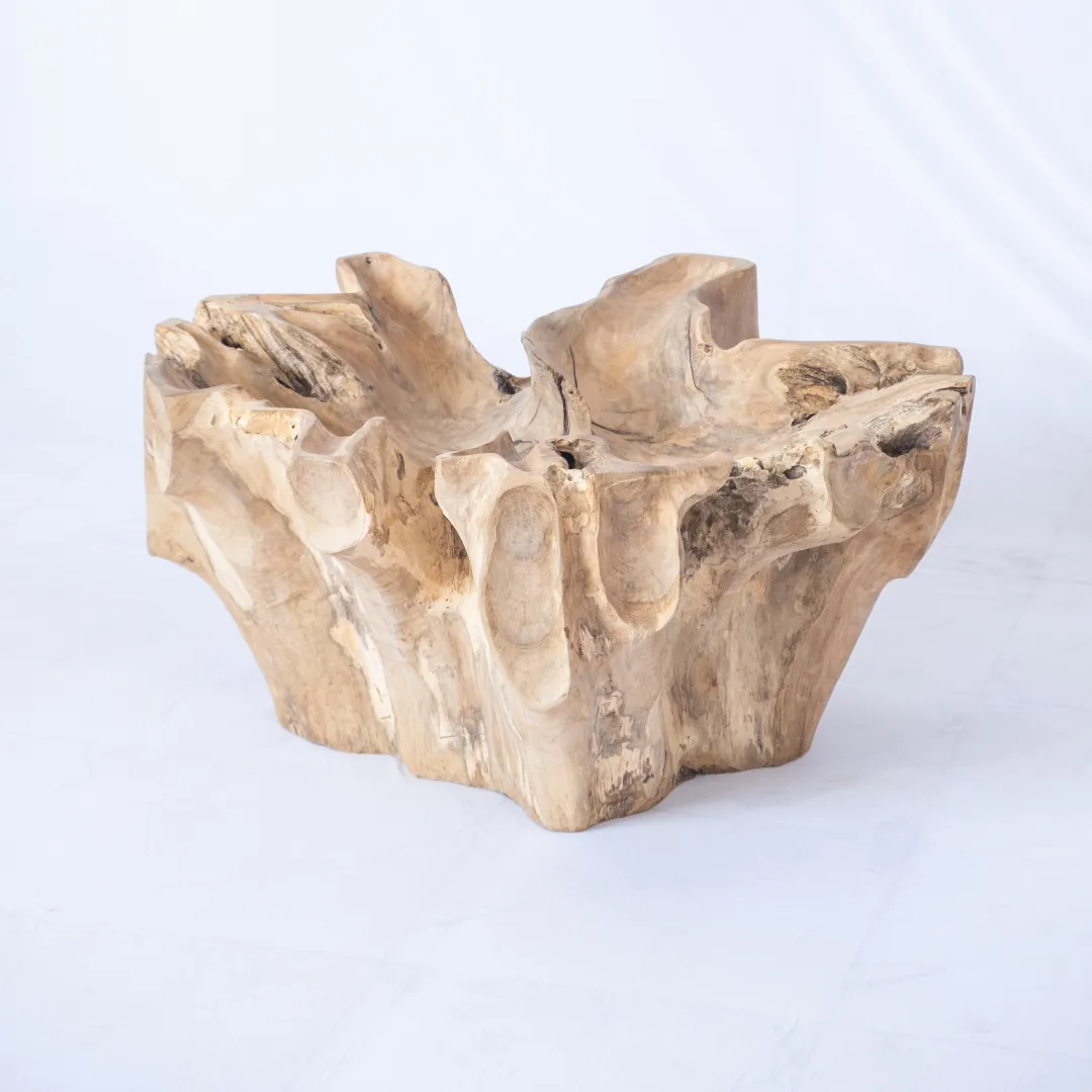 Base de mesa de centro o auxiliar hecha con raíz de teka esculpida y pulida manualmente. Se recomienda colocar tapa de vidrio de 1m 0 1,20 mts. La tapa de la mesa no esta incluida. Piezas únicas.