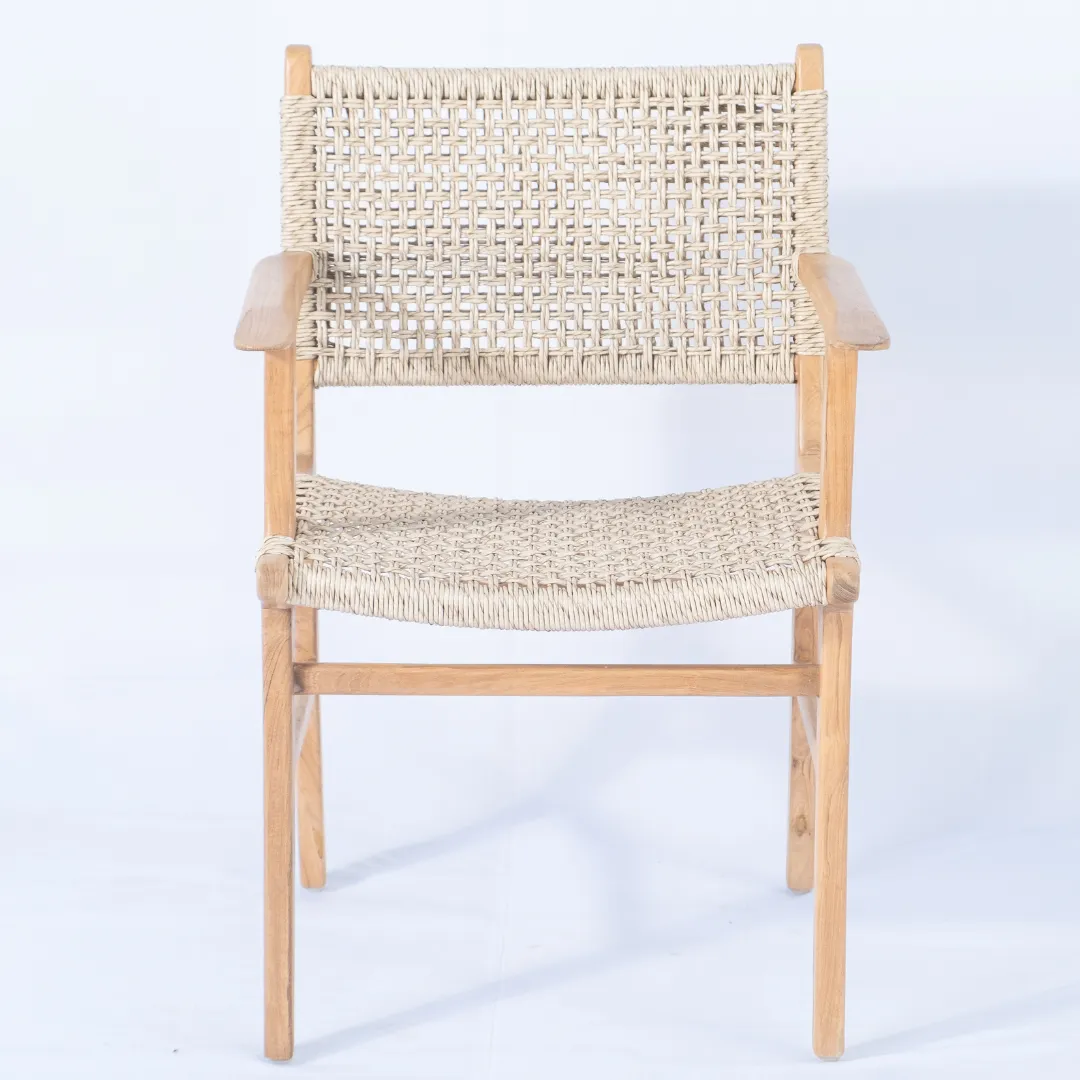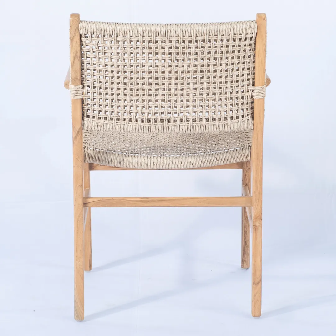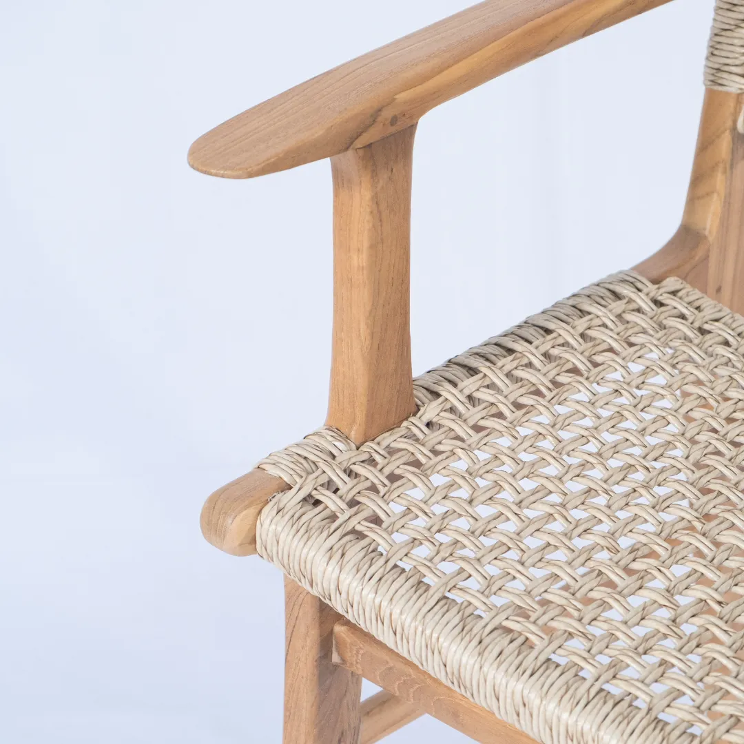 Silla de madera de teka y loom de trama abierta, con apoyabrazos. Apto para exterior techado.