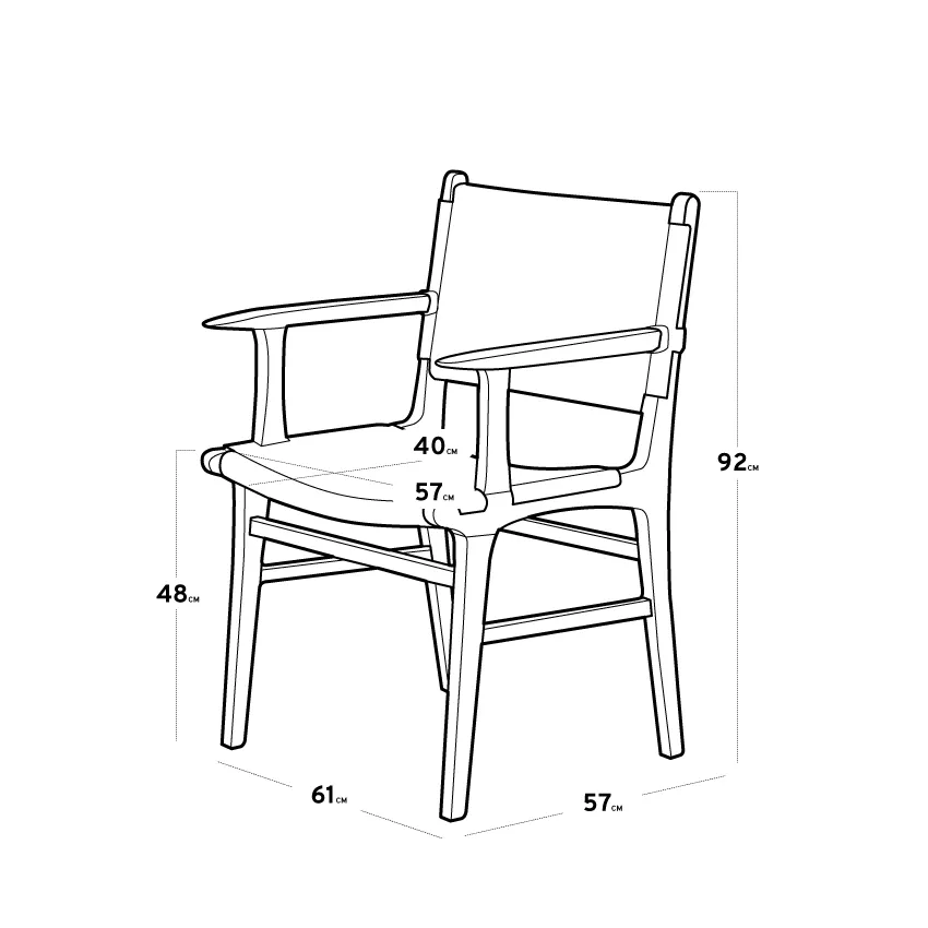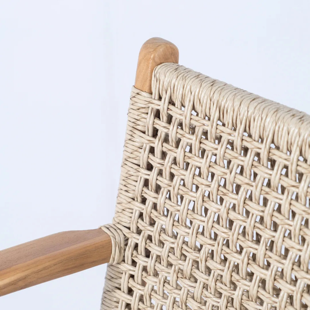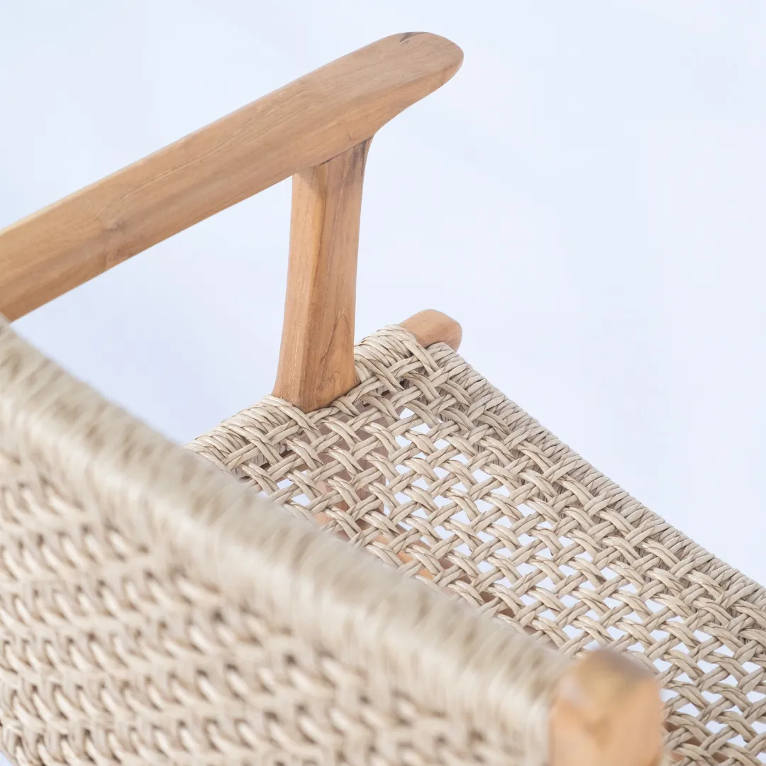 Silla de madera de teka y loom de trama abierta, con apoyabrazos. Apto para exterior techado.