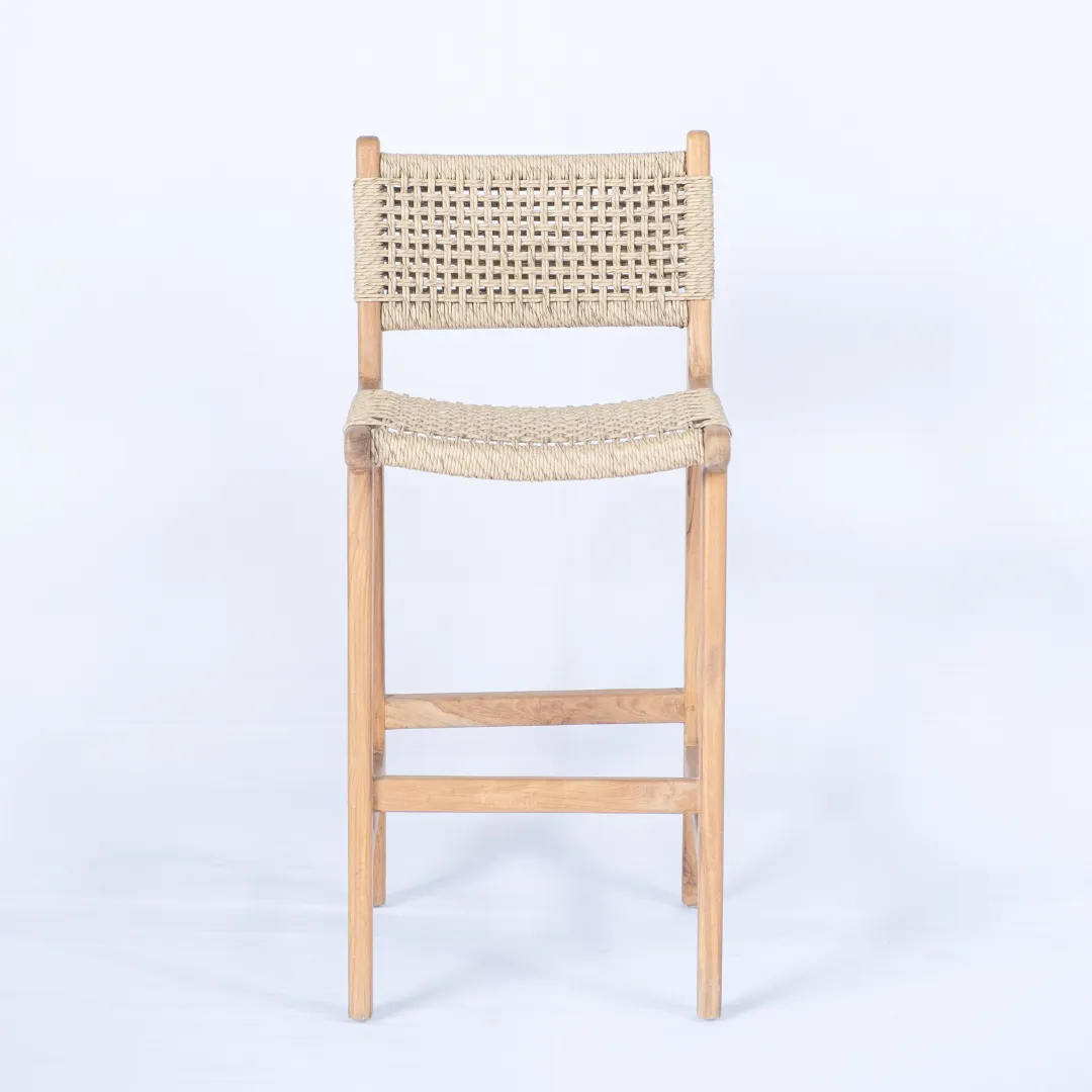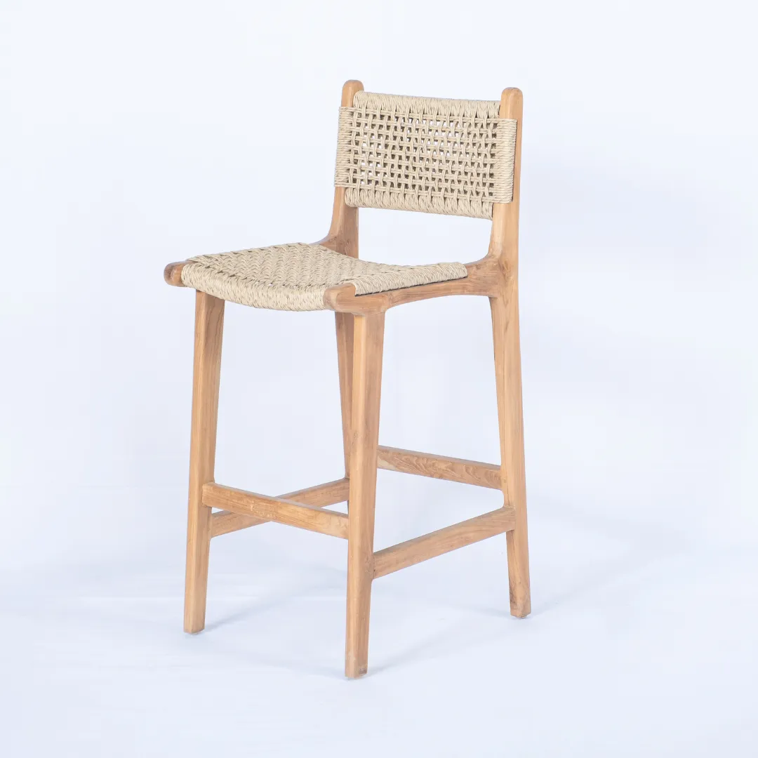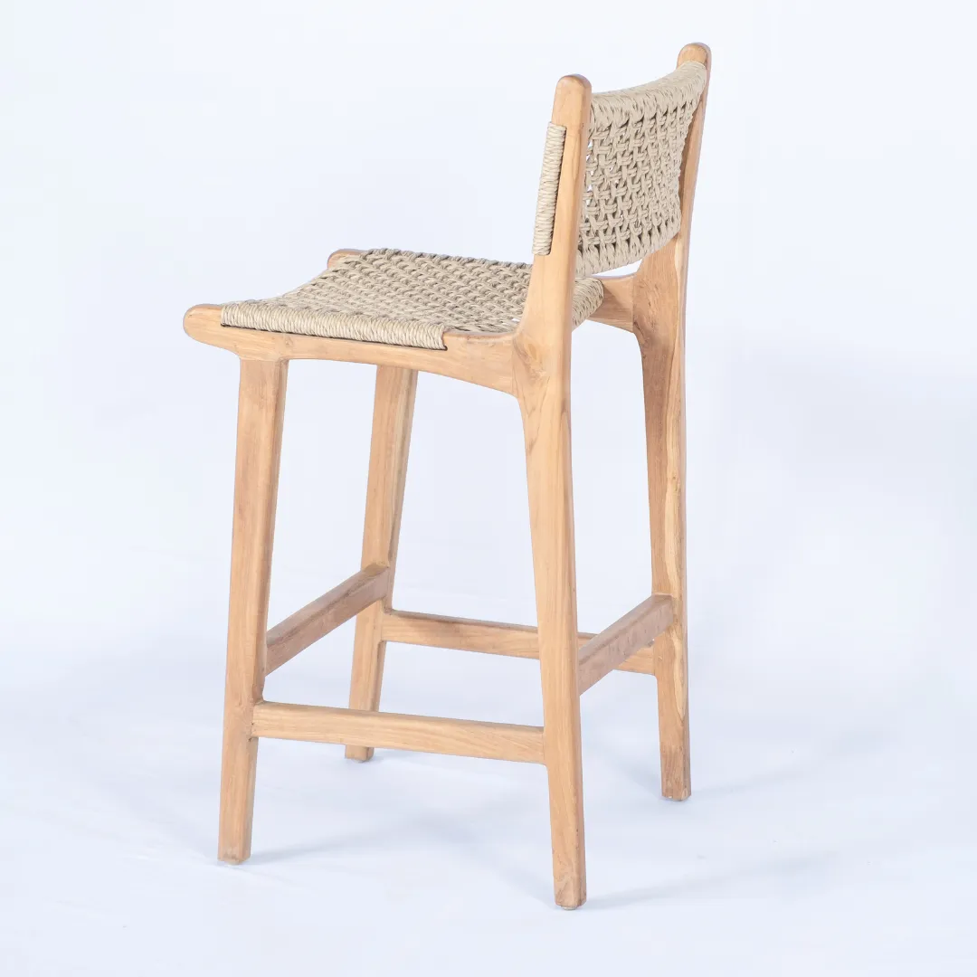 Banqueta alta de madera de teka y fibra sintética de trama abierta, con respaldo. Apta para exterior. Recomendada para mesadas de 85 a 95 cm de altura.