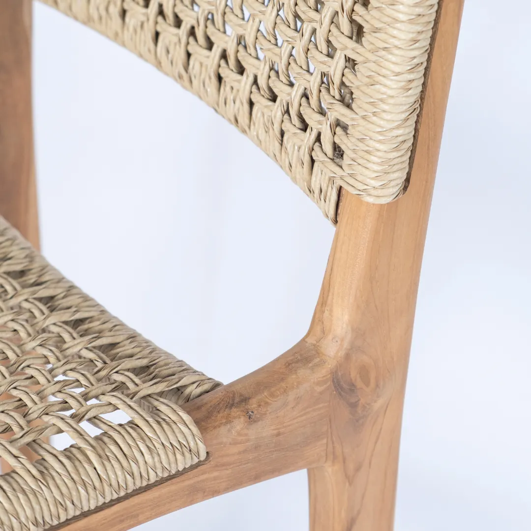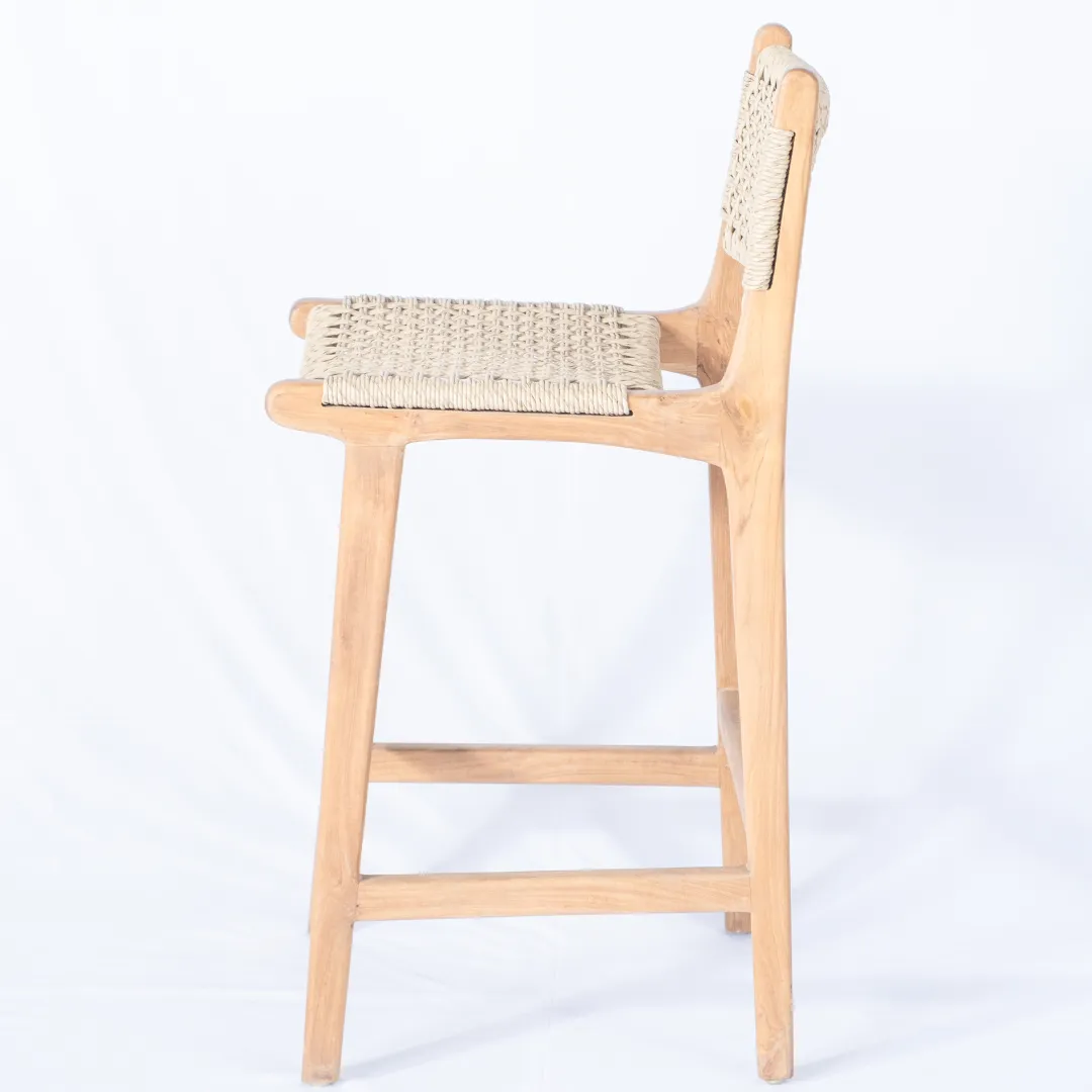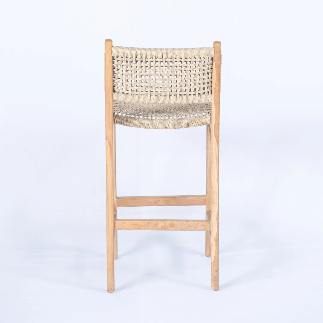 Banqueta alta de madera de teka y fibra sintética de trama abierta, con respaldo. Apta para exterior. Recomendada para mesadas de 85 a 95 cm de altura.