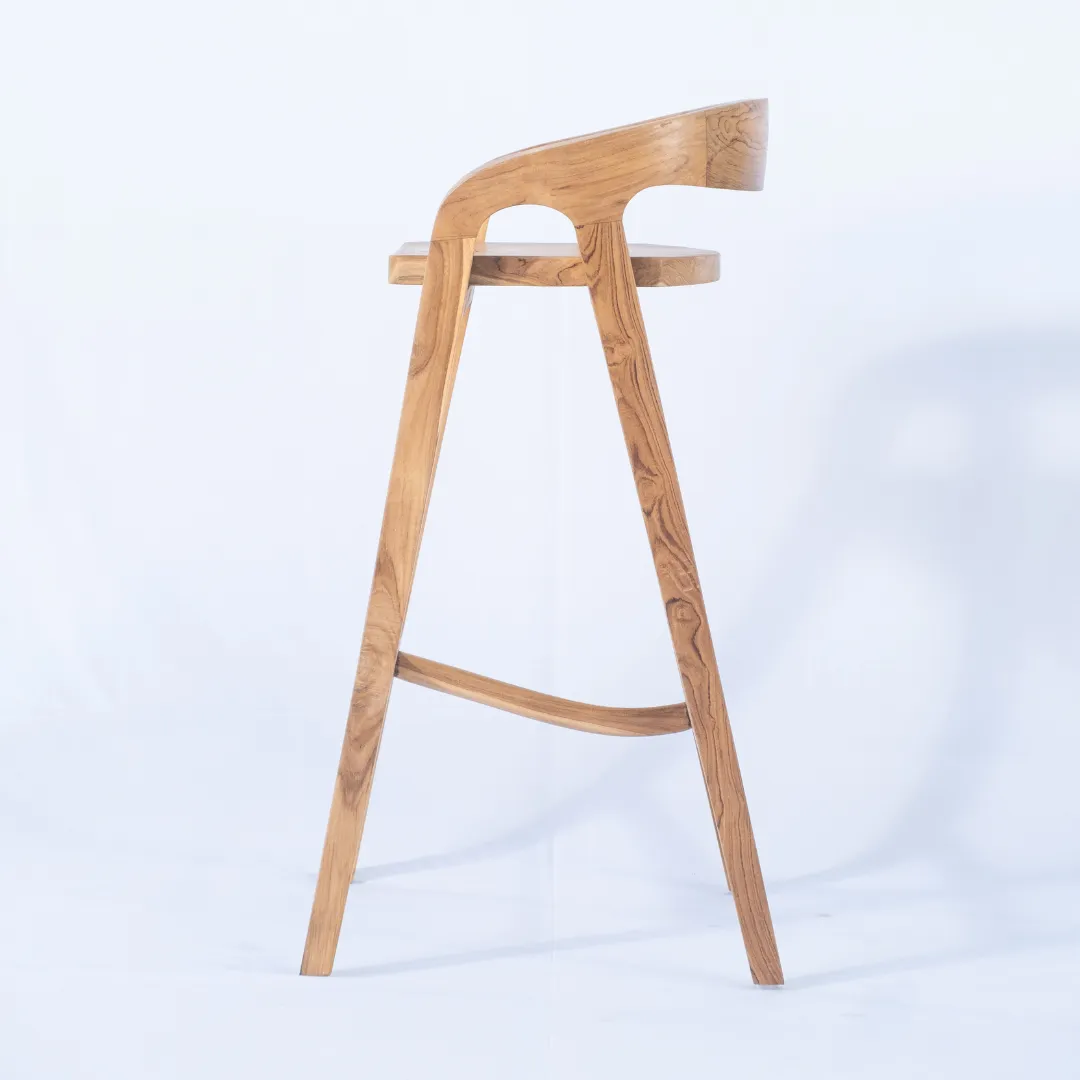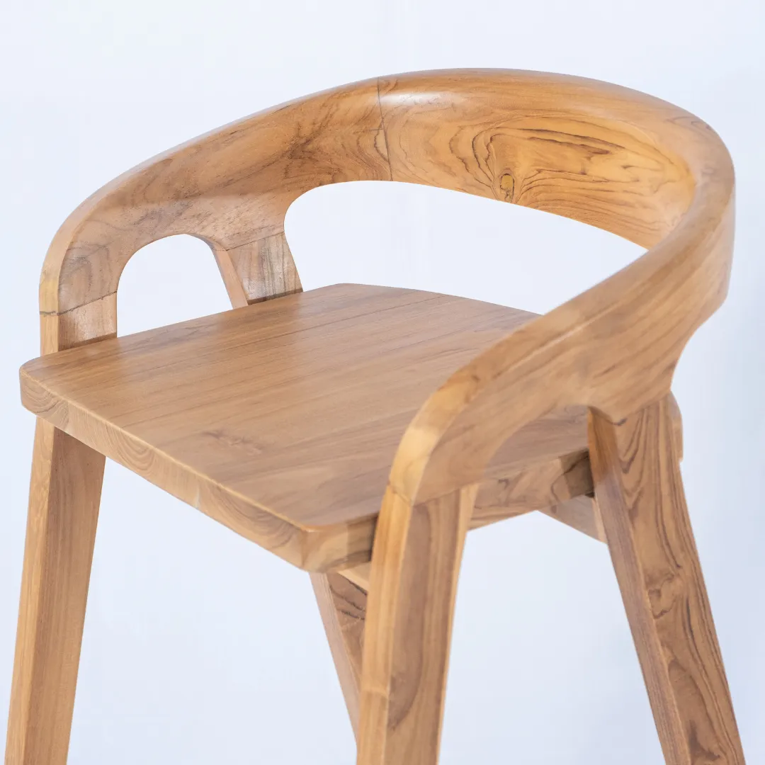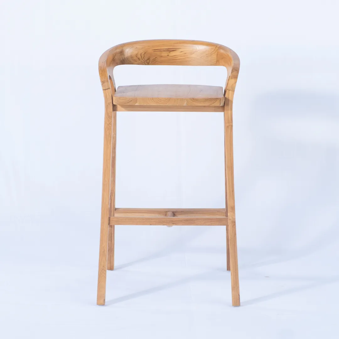 Banqueta alta de madera de teka con respaldo bajo envolvente. Apta para exterior. Recomendada para barras de 110 a 120 cm de altura.