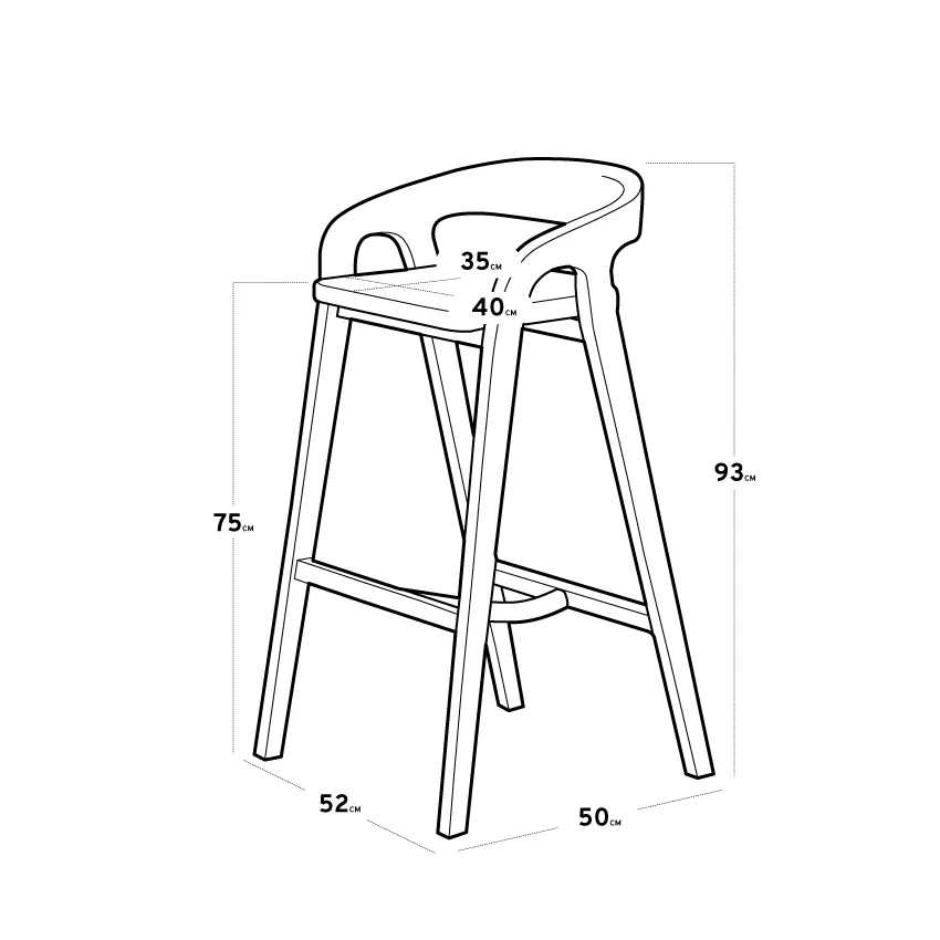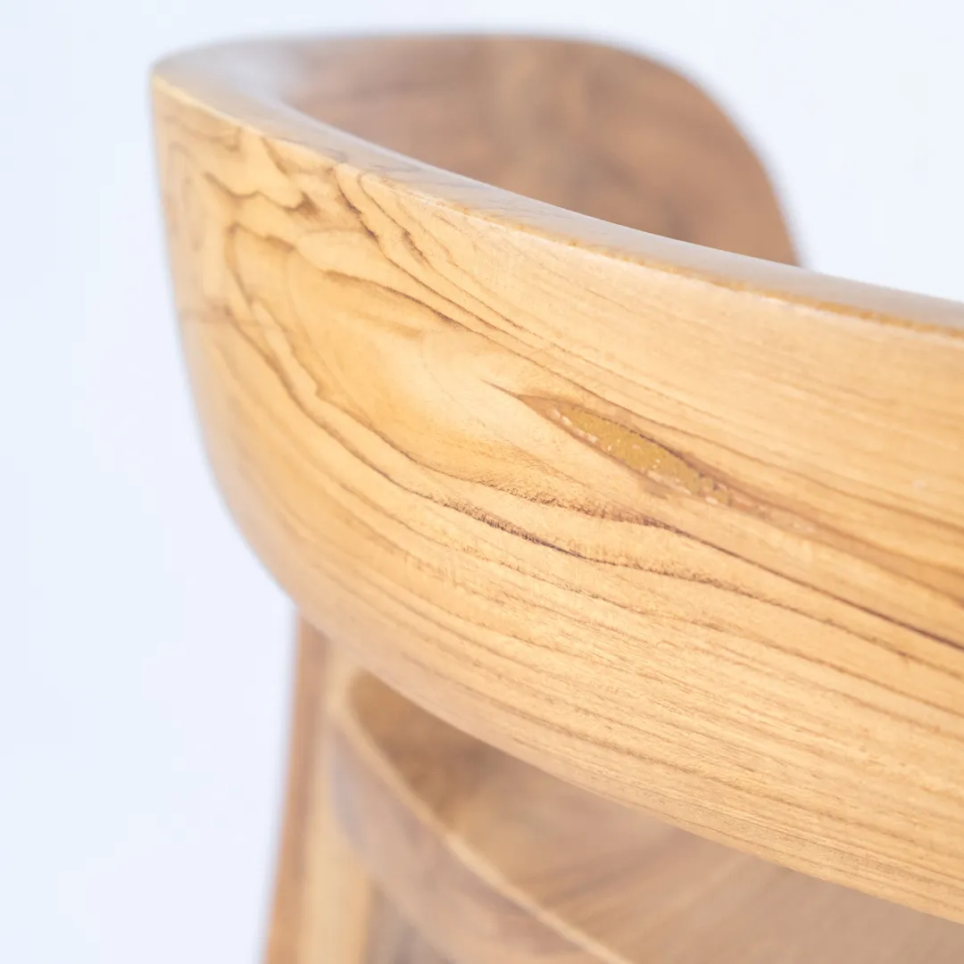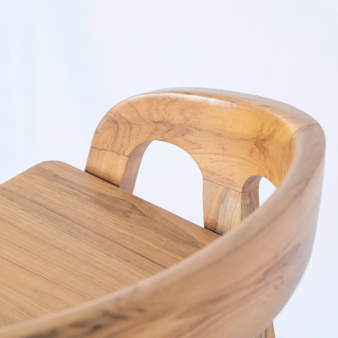 Banqueta alta de madera de teka con respaldo bajo envolvente. Apta para exterior. Recomendada para barras de 110 a 120 cm de altura.