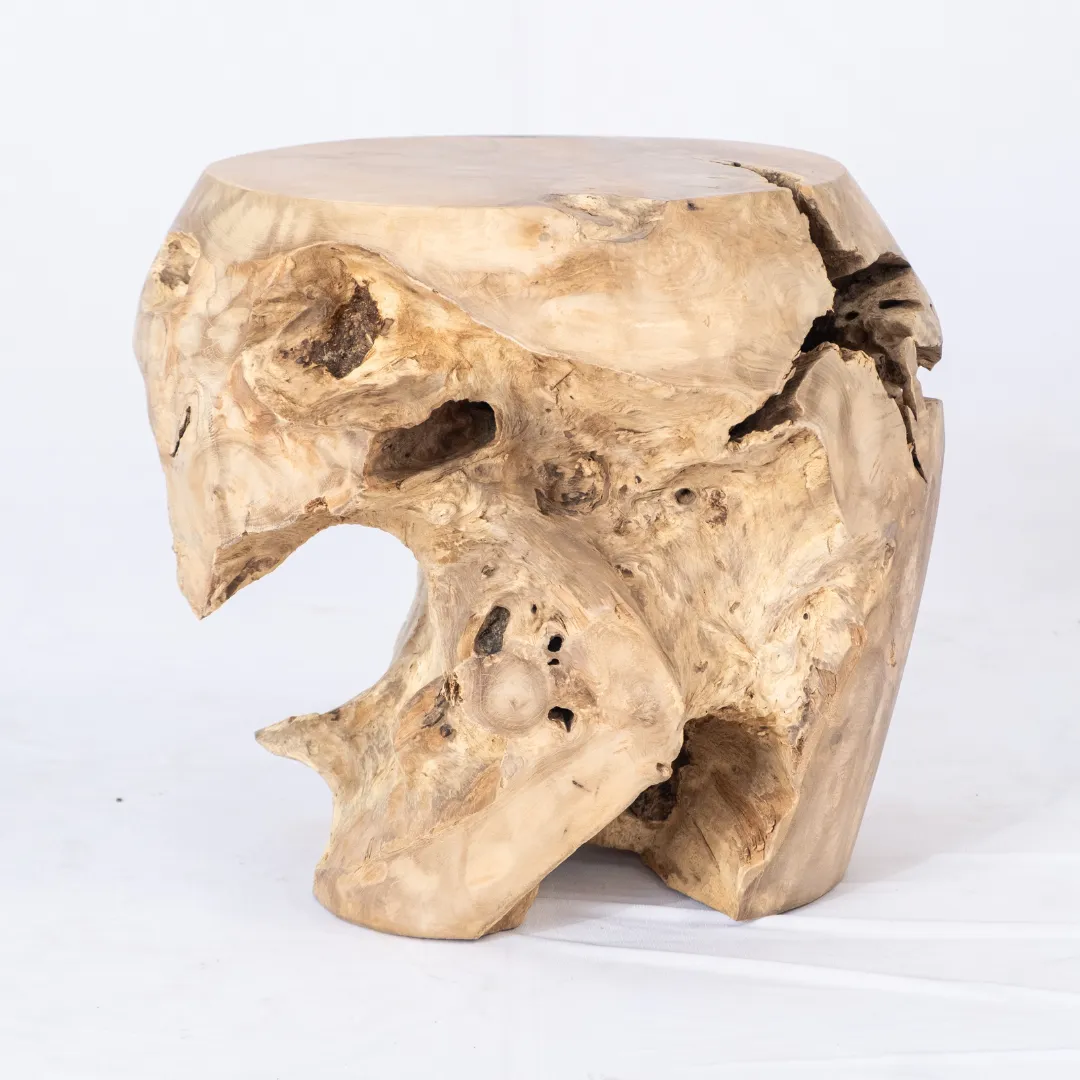 Taburete hecho con raiz de teka esculpida y pulida manualmente. Puede ser usado como mesa auxiliar. Piezas únicas.